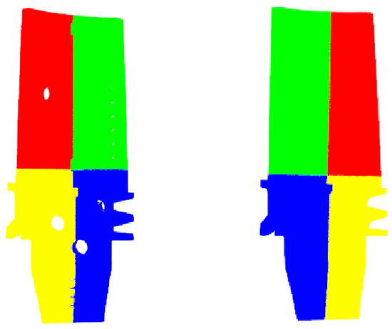 For every point in the point cloud P, we compute the vector , where is the centroid of the point cloud P. The point cloud P can be divided into four blocks along and , respectively, by computing the angle between vector and or . An example of a divided-block scene and model point cloud is displayed in Figure 6. The left is the scene point cloud and the right is the model point cloud.