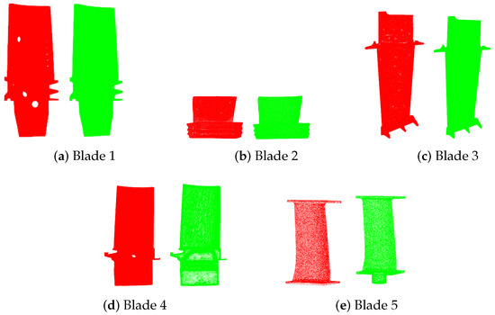 The experiments were conducted using five blades, as shown in Figure 7. Details of the blades are given in Table 2. Blades 1–4 were scanned with marker points on the body since their sizes were not large enough to be clamped. However, as a result of the scanning process, there are missing parts (holes) on the blade body of Blades 1–4 due to the occlusion of marker points. Blade 5 was placed on a fixture table during scanning, resulting in a missing part at the bottom. For the model point cloud, CAD data of the five blades were sampled by the point cloud processing software CloudCompare. The number of points and the size of the blades are also shown in Table 2. The bounding box dimensions represent the length, width and height of the point cloud, respectively.