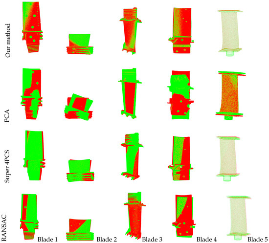 In order to compare the performance of the proposed algorithm, we also implemented PCA [20], Super 4PCSs [15] and RANSAC [12], as shown in Figure 8 and Table 3, respectively. RANSAC combines Harris 3D [17] as a keypoint detector and FPFHs [19] as a descriptor for point cloud registration. In Figure 8, for Blade 2, the PCA fails with a large inclination angle. There is a converse result for Blade 4. The registration result of the PCA for Blade 5 is a deviation in height because the bottom of the scene point cloud is missing. Super 4PCSs produce a better result than the PCA in all blades. However, they all have similar deviations. RANSAC has an unstable alignment effect and needs to adjust the parameters several times according to the experimental object to obtain better registration results.