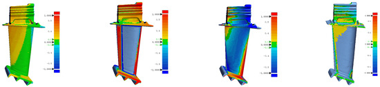 To enable a clearer comparison of experimental results, we selected Blade 3 for a comparison of color deviation graphs, as shown in Figure 9. The maximum and minimum ranges of the color fields are set to 1 mm and −1 mm, respectively, and the gray-blue part in the figure indicates the area outside the color display range. A tolerance of 0.1 mm is specified, and, as a result, 61%, 58%, 48% and 47% of points fall within the tolerance for our method, PCA coarse registration, Super 4PCS coarse registration and RANSAC coarse registration, respectively.