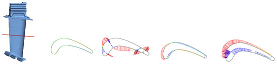 To compare the deviations of a certain cross-section of Blade 3, we show the deviation comparison in Figure 10. The connecting lines between the points indicate the corresponding point pairs used for deviation calculation. Due to the influence of the main direction sign on the rotation matrix, PCA registration performs the worst for Blade 3, resulting in the opposite direction of the blade after registration. Table 4 presents the quantitative analysis of the registration deviation for a certain cross-section of Blade 3, including the maximum deviation, minimum deviation, and mean deviation.
