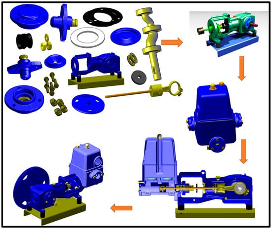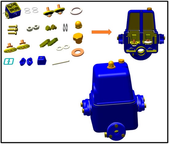Repairing a gearbox (i.e., a complex task) and inspecting the pump housing seals (i.e., simple task) were the primary areas of attention in this study of piston pump overhaul maintenance. Figure 1 shows the parts and the fully built piston pump housing. Figure 1 displays the parts and completely assembled condition of the piston pump gearbox, specifically designed for the complex task. Participants were tasked with repairing the piston pump gearbox and thoroughly examining all of its seals. This assignment required the assembly of 32 sets of components in 40 steps, utilizing a soft hammer, screwdriver, jig, puller, and open-ended wrench. Figure 2 shows a detailed picture of the pump housing, illustrating its components separately for the purpose of the simple task. The task involved personnel verifying all the pump’s housing seals when disassembling its pieces. This activity was less arduous than the intricate task as it involved fewer stages (26), utilizing non-specialized hand tools and lightweight components. The level of intricacy and the specific procedures for the two jobs are comprehensively explained and have been assessed through experimentation in studies conducted by Alhaag et al. [47] and Alessa et al. [21,46].