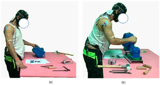 The next day, participants’ bodies were equipped with Ag/AgCl electrodes for EMG. The EMG signal data were collected while the subjects performed MVC. Additionally, EMG signals were gathered throughout every training procedure and maintenance activity. Participants in Group 1, referred to as the AR guiding group, were allocated a task to accomplish using AR instructions. The tasks could be either complex or simple, as indicated. The allocation of tasks was carried out using a counterbalancing strategy to minimize the impact of task order. Two sequences, AB and BA, were used, with A representing complicated tasks and B representing simple activities. In the AB sequence, half of the participants in Group 1 initially participated in a complex task. The remaining participants were given the BA sequences to perform the simple task first. During this session, participants successfully finished 50% of the experiment, which involved either a simple or a complex activity.