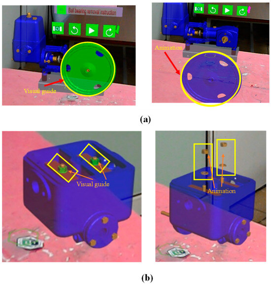 Examples of AR experience as viewed via Microsoft HoloLens: (a) AR instruction for removing the V-belt pulley from the crankshaft during the complex task; (b) AR instruction for removing the hex nuts and washers from the valve bridge stud bolts during the simple task.