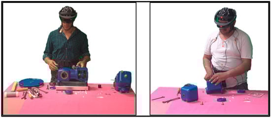 Prior to participating in the study, all individuals were asked to review and sign an informed consent document that had been approved by the Institutional Review Board at King Saud University (approval code: E-19-4467). Upon their arrival, participants were given a health questionnaire to complete and received a thorough briefing about the study’s goals and procedures. They also filled out surveys assessing their prior experience with AR in maintenance activities. Following this, participants were randomly divided into two groups for the experiment. The first group received training using augmented reality (AR) via the first iteration of Microsoft HoloLens1, released in 2019. The training focused on maintenance procedures and involved a brief 10–15 min session to familiarize participants with HoloLens and its functionalities [23,53]. The training involved a demonstration of disassembling and assembling a scooter, during which participants were instructed on the correct utilization of the toolkit. The second group was provided with printed documents on A4 paper for the assignments. Once participants had familiarized themselves with their respective instructional approach, either paper-based or HoloLens guidance, they returned the next day to carry out the maintenance activities using the assigned methods.