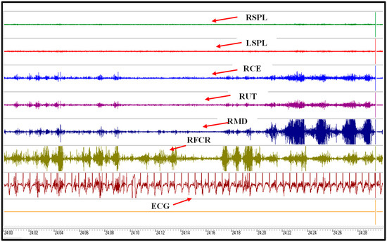 The EMG signals were recorded using an eight-channel Mega amplifier (ME 6000) from Mega Electronics Ltd., Kuopio, Finland. The system operated at a sampling rate of 1000 Hz with a 14-bit resolution, and the electrode impedance was maintained below 10 kΩ. Before electrode placement, the skin at each recording site was carefully prepared by shaving any excess hair and cleaning the area with a 70% isopropyl alcohol swab. After the skin was dried, pre-gelled 20-mm silver/silver chloride (Ag/AgCl) adhesive electrodes (Blue Sensor, Ambu A/S, Ballerup, Denmark) were applied to measure muscle activity in six specific muscles, as illustrated in Figure 6. EMG signals were collected from six specific muscles: RSPL, LSPL, RCE, RUT, RMD, and RFCR, as illustrated in Figure 7. A band pass filter with a frequency range of 15–450 Hz was used to eliminate low-frequency artifacts, including motion potentials, surrounding muscle activity, and respiration [48]. Subsequently, a 60-Hz notch filter was employed to eliminate the 60 Hz power line interference present in the recorded EMG signals [48,49]. The muscle activities observed at the maximal voluntary contraction (MVC) of the six muscles under investigation were recorded. These recordings were utilized to normalize the muscle activities observed under the experimental conditions.