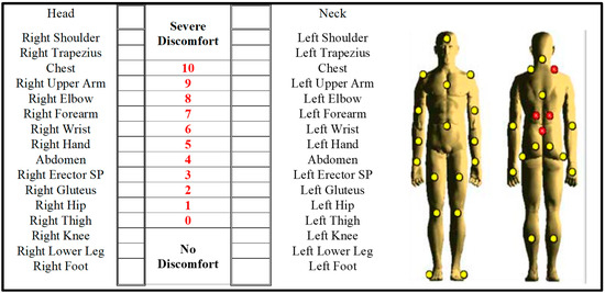 - Corlett, E.N.; Bishop, R.P. A Technique for Assessing Postural Discomfort. Ergonomics 1976, 19, 175–182. [Google Scholar] [CrossRef]