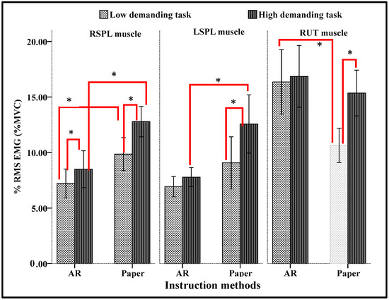 Additional analyses were conducted using paired and independent t-tests to examine the variations in % RMS EMG (%MVC) across different levels of task complexity and instructional approaches. Figure 9 shows the interaction effects between task complexity and instruction methods on %RMS EMG (%MVC) for RSPL, LSPL, and RUT muscles, respectively. For the RSPL muscle (Figure 9), pairwise comparisons at each level of the instruction method revealed that both AR and paper-based approaches resulted in significantly higher % RMS EMG (%MVC) during high-demand tasks compared with low-demand tasks (p < 0.05). Furthermore, within both task complexities, AR-based instruction led to significantly lower RSPL muscle activity compared with paper-based instruction (p < 0.05). The magnitude of this reduction in muscle activity with AR was more pronounced during high-demand tasks. These findings suggest that employing augmented reality (AR) instructions for both task complexities significantly decreased the physical strain on the RSPL muscle, with a greater effect observed during more complex tasks.