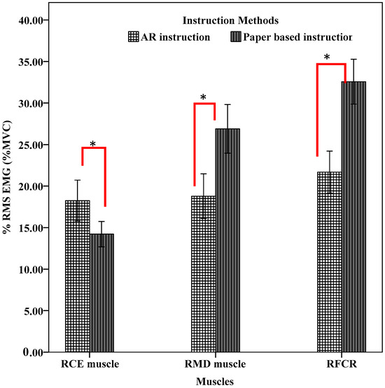 Figure 10 shows the main effects of instruction method on % RMS EMG (%MVC) for the RCE, RMD, and RFCR muscles. The results indicated that using AR instruction led to significantly higher muscle activity in the RCE muscle compared with paper-based instruction (p < 0.05). In contrast, AR instruction resulted in significantly lower muscle activity in both the RMD and RFCR muscles compared with paper-based instruction (p < 0.05). These findings suggested that while AR instruction increased strain on the RCE muscle, it effectively reduced strain on the RMD and RFCR muscles, regardless of the task being performed.
