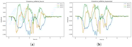 Data enhancement techniques were prevalent in domains like image recognition, where minor variations such as dithering, scaling, cropping, distortion, and rotation naturally occur during observation. These methods, which do not alter the original image’s category labels, are integral to image data augmentation, as referenced in [38]. Extending this concept to time-series data, most enhancement strategies rely on random transformations of the training dataset. This includes the introduction of random noise [39], random cropping [40], random scaling [41], and both random warping and frequency warping along the time dimension [42], all aimed at enriching the dataset without changing its underlying labels. Similar to Um et al. [43], random time bending and axis rotation were performed, and the enhancement process is shown in Figure 1. The waveforms of the data before and after enhancement are shown in Figure 2. To maintain the authenticity of the PD samples in the experiment, no data augmentation was applied to them. To achieve a relatively balanced state in the sample data, the HC was expanded by a factor of two, and the DD was expanded by a factor of one. Therefore, there are now 276 PD, 237 HC, and 228 DD samples.