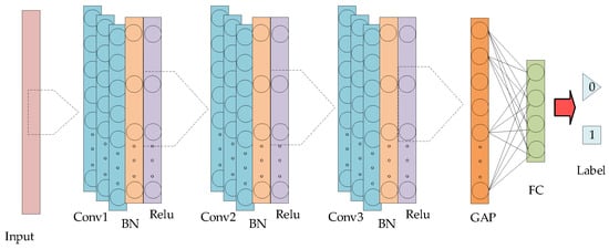 In order to detect Parkinson’s disease patients from the participants, a novel deep learning model for sensor data was proposed. The model combined LSTM_FCN and a channel attention mechanism. Temporal convolution, a technique that involved applying convolutional operations along the time axis, had proven to be an effective learning model for time-series classification problems [44]. Temporal convolution was an effective method for time-series classification. It used convolution along the time axis. Fully convolutional networks with temporal convolution served as feature extractors [45]. The fully connected (FC) layer flattened the convolutional feature maps into a one-dimensional sequence, which aided in connecting to activation functions for category prediction. All the FC layers in FCN were replaced by the Global Average Pooling (GAP), which made the input size of the network unrestricted and strengthened the network’s generalization ability. In addition, the structure of FCN made it more competent in time-series classification tasks. Since time-series data differed greatly in dimension and length from image inputs, FCNs could efficiently retain and extract complex information from time series to prevent the loss of key features [46]. The structure of FCN is shown in Figure 3.