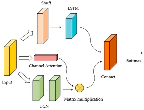 As depicted in Figure 5, the full convolutional block and the LSTM block processed the same time-series input but from two distinct perspectives. The full convolutional block was composed of three sequentially arranged temporal convolutional blocks, each equipped with filters with 128, 256, and 128 layers, respectively. Within each block, a temporal convolutional layer was paired with batch normalization [50]. Feature extraction was accomplished by passing the data through a third convolutional block. The feature-extracted data were multiplied with the channel attention weights to incorporate the channel attention into the global features. At the same time, the time-series input was transmitted to the dimensional blending layer. Following the dimensional blending transformation of the time series, the data were fed into the LSTM block. This particular block in the model architecture consisted of a standard LSTM layer, which was adept at capturing temporal dependencies within the data. It was succeeded by a dropout layer, a regularization technique that was crucial for enhancing the model’s generalization capabilities. This random deactivation forced the network to develop redundant representations and prevented it from becoming too reliant on any particular set of neurons. The outputs from both the FCN and the LSTM blocks were then concatenated. This combined data stream was subsequently forwarded to the SoftMax classification layer, which assigned a probability distribution over the predicted output classes, facilitating the final classification decision.