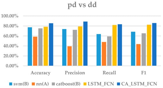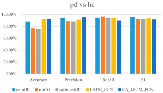 As shown in Figure 8, for the pd vs. hc task, the network model effect of our proposed CA_LSTM_FCN was higher than that presented by Julian Varghese et al., who combined a machine learning approach with feature extraction in terms of accuracy and precision; the results were only slightly lower than the other methods in terms of recall and F1 value. From Figure 9, it can be noticed that the performance of the proposed method in this paper exceeded the previous results in both cases, with an improvement of nearly 20% in recall and more than 10% in other metrics.