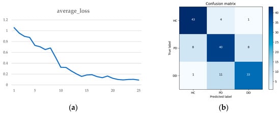 Pd vs. hc vs. dd: (a) loss function; (b) confusion matrix.