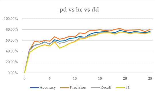 However, the previous two dichotomous tasks, which limited the comparisons to two-by-two, amounted to classification experiments under a priori conditions. Therefore, a new experiment was added to this, namely pd vs. hc vs. dd. This task puts together samples from all the participants in the dataset in a three-classification experiment. It allows for a better diagnosis from an unqualified population to see if they are likely to have Parkinson’s disease, in line with the intended effect of this project.