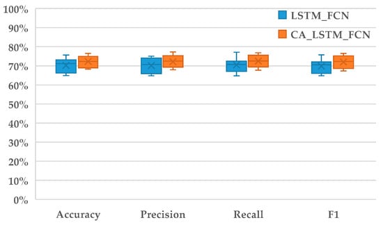 Boxplots are a very useful tool to help us quickly understand the performance distribution of different models and to make visual comparisons. Figure 12 shows the results obtained from different deep learning models in the analysis of various metrics. The comparison showed that the CA_LSTM_FCN model proposed in this paper also performed well in the triple classification task, which was basically higher than the model before improvement. The performance of the model was stable in different situations, with better central tendency and stability in all metrics.