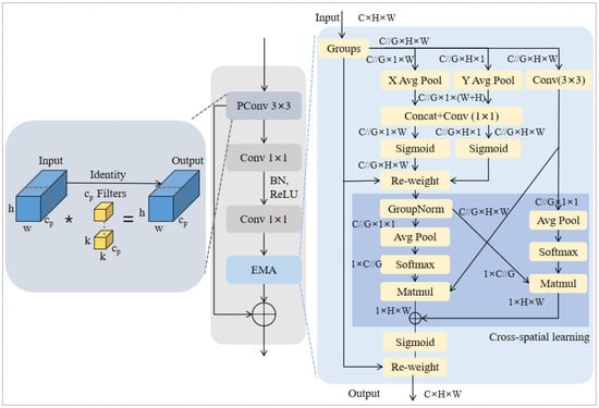 Modelling cross-channel relationships through channel dimensionality reduction may have a negative impact on deep visual feature extraction; to address this problem, we introduce the EMA model without dimensionality reduction, thereby preserving the information of each channel while reducing computational overhead. Additionally, EMA introduces an information aggregation method across spatial dimensions, enabling richer feature fusion. When EMA is combined with the FasterBlock module, the resulting FEA module further reduces computational costs and selectively emphasizes key local features while maintaining attention on global features. This improves the detection performance of the models for multi-scale targets. The structure of FasterBlock–EMA is illustrated in Figure 3, where * represents the convolution operation.