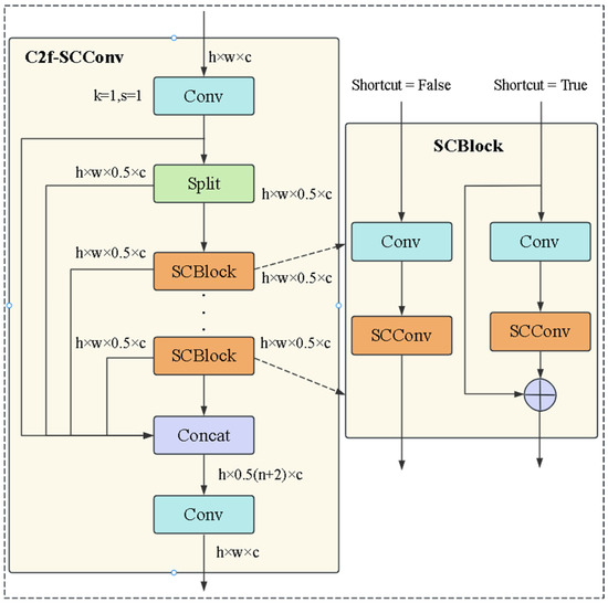 In target detection tasks, the extraction of redundant features by convolutional layers not only increases the computational burden and memory consumption but may also degrade model performance, particularly in complex scenes and for small targets. To address these challenges, this paper introduces the Spatial and Channel Reconstruction Convolution (SCConv) [24] to improve the Bottleneck module in the original C2f structure. The proposed C2f-SCConv module replaces standard convolution with SCConv, forming a new SCBlock module that is embedded in the C2f structure. The structure of this module is shown in Figure 4, where h and w represent the height and width of the original feature map, c is the number of channels, and n denotes the number of layers.