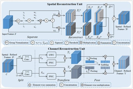 The structure of SCConv is shown in Figure 5 and primarily consists of the Spatial Reconstruction Unit (SRU) and the Channel Reconstruction Unit (CRU). The SRU addresses spatial redundancy by employing weight decomposition to separate and reconstruct redundant features, thereby suppressing redundancy in spatial dimensions and enhancing the expressiveness of the features. The CRU adopts a “split–transform–merge” strategy to effectively reduce channel redundancy, lowering computational and storage costs. By combining these two reconstruction units, SCConv accurately captures complex relationships within the input features. This not only controls feature redundancy but also reduces the number of model parameters and floating-point operations per second (FLOPs), significantly enhancing the model’s feature extraction capability.