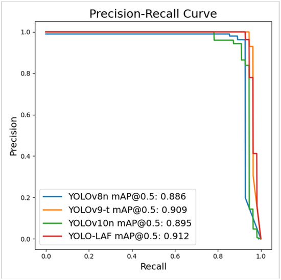 Table 8 and Table 9 show the performance comparison of different detection algorithms. Faster R-CNN is more computationally intensive and slower due to its complexity. The YOLO family of algorithms (YOLOv3, YOLOv5s, YOLOX, YOLOv7, etc.) significantly reduces the number of parameters and the amount of computation through iterative versions. However, there is still room for optimization in terms of feature fusion and minimizing information loss. Although YOLOv9 and YOLOv10 outperform YOLOv8n in terms of accuracy and number of parameters, their generalization ability is weaker in transmission line foreign object detection, especially when detecting small targets or partially occluded objects, where accuracy decreases significantly. The YOLO-LAF model proposed in this paper not only reduces the number of parameters to 2.35M and 2.45M and the computational cost to 6.9 GFLOPs and 8.5 GFLOPs but also improves detection accuracy to 91.2% and 85.3%, respectively. Meanwhile, YOLO-LAF exhibits less fluctuation on the precision-recall curve (e.g., Figure 8), demonstrating higher stability and generalization.