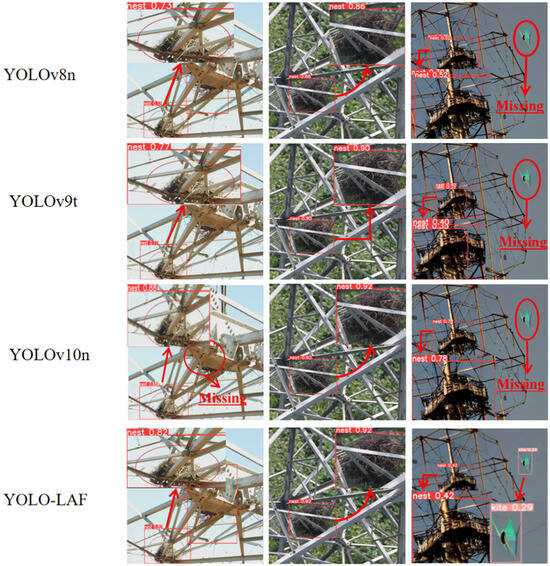 To more intuitively compare the performance of the transmission line foreign object detection model before and after the improvement, this paper selects representative images for visual analysis, with some of the detection results shown in Figure 9. From the figure, it can be observed that the Faster R-CNN algorithm exhibited serious misdetection and omission, as indicated by the red circles in the figure. Although the YOLOv5s, YOLOv7-tiny, YOLOv8n, YOLOv9t, and YOLOv10n algorithms showed improved detection results, misdetections and false detections still occurred due to the foreign object targets occupying fewer pixels in the image. Additionally, the detection results of references [17,18] showed even more pronounced cases of misdetection and false detection. In contrast, the improved YOLO-LAF algorithm proposed in this paper can effectively solve the leakage and misdetection problems existing in other algorithms. The detection accuracy was significantly improved while meeting the speed requirements for real-time detection, making it more suitable for actual transmission line foreign object detection tasks.