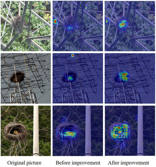 To clearly demonstrate the effectiveness of the proposed method in regional image quality assessment, this paper employs Gradient-weighted Class Activation Mapping (Grad-CAM [33]) for heatmap visualization analysis. Grad-CAM generates heatmaps by computing the gradients of the feature maps from convolutional neural networks, highlighting the model’s focus on different areas during image quality detection. Figure 10 illustrates the heatmaps before and after the model improvements, where red indicates the regions of highest attention, yellow represents areas with moderate attention, and blue signifies areas with minimal impact on image recognition. As shown in Figure 10, the contours and shapes of the target regions of the improved YOLOv8-LAF model’s heat map are much clearer, revealing more high-confidence regions. Especially in scenes with complex backgrounds or dense targets, the enhanced feature extraction of the target makes the demarcation between the target region and the background more obvious, while also providing stronger noise suppression. Furthermore, through the optimization of the feature extraction module, the model effectively reduces the high rate of responses to the background region, allowing the heatmap to focus more on the target.