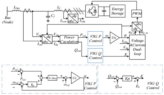 The VSG control method is designed based on the mechanical equations of a synchronous generator (SG) to develop an active power control loop, thereby establishing frequency and phase references [,]. To adapt the VSG control to many different situations, including filter type, sensor type and location, and dc-link power source type, many different VSG methods are proposed [,,]. The critical parts of them include active and reactive power control, which relate to the frequency and voltage control, respectively [,]. By controlling the power of energy storage on the inverter’s dc side, the VSG provides rotational kinetic energy to simulate the inertia of SG, offering damping and inertia after frequency variations. Moreover, reactive power control, like virtual excitation control or direct reactive power droop control [], is investigated for optimizing control strategies to enhance voltage performance in the dynamic state [].