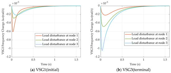 Using the transfer function presented in Section 3, the dynamic frequency responses of each VSG can be obtained under load step changes at different nodes. By analyzing the maximum frequency deviation (MFD), rate of change of frequency (RoCoF) and adjustment time to reach a steady state under disturbances, the dynamic characteristics of each VSG can be assessed.