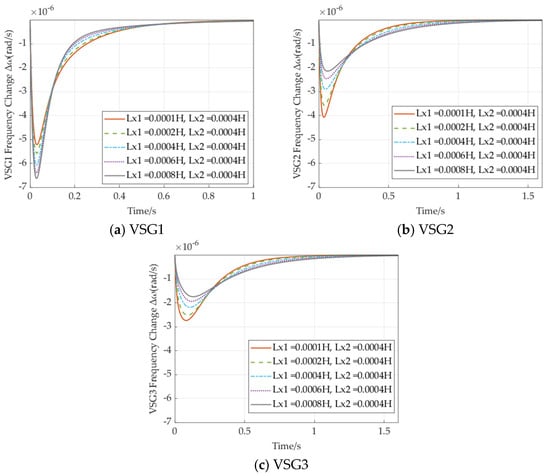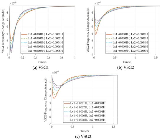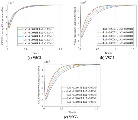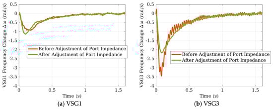 This demonstrates that increasing port impedance can negatively impact the dynamic characteristics of VSGs at other nodes. Additionally, it is observed that the frequency response deviation of VSG3 is notably larger than that of VSG1, corroborating the conclusion in Section 4.1.