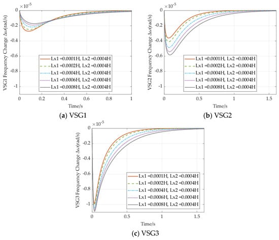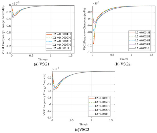 At the same time, the frequency response of neighboring VSGs, VSG1 and VSG3, follows a similar pattern. As the port impedance L2 increases to 1 mH, the frequency deviation range and rate reach their maximum, causing a deterioration in frequency characteristics. When L2 is reduced gradually to 0.2 mH, the frequency deviation decreases and reaches its minimum value. However, further decreasing L2 to 0.1 mH results in an increase in frequency deviation range.