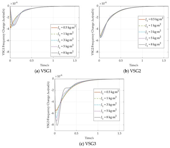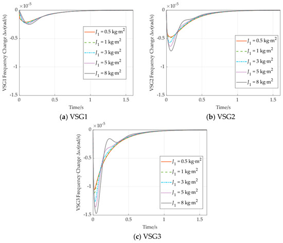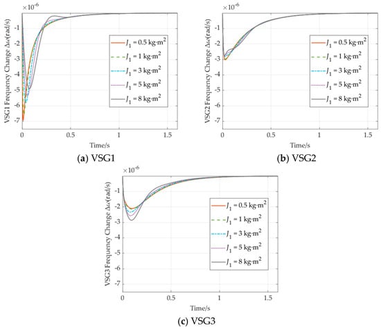 VSGs require additional capacity to provide virtual inertia, with larger virtual rotational inertia necessitating greater investment. Therefore, optimizing the allocation of virtual inertia is crucial from an economic perspective. In this section, the impact of virtual inertia allocation is analyzed using a three-node, three-VSG model. To evaluate the effect of varying inertia on the dynamic frequency response of VSGs under load disturbances, three scenarios are considered. The parameters are detailed in Table 3, and the results are presented in Figure 9, Figure 10, Figure 11, Figure 12, Figure 13 and Figure 14.
