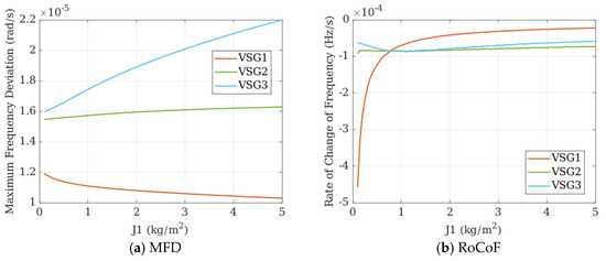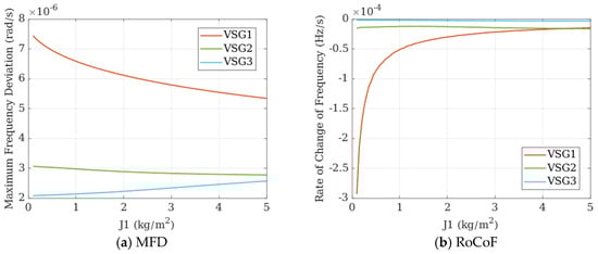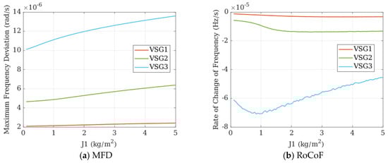 In Figure 22, similarly, when only the inertia is changed without altering the port impedance, the RoCoF of VSG3 decreases, but the MFD of VSG3 shows little variation. Meanwhile, the RoCoF of VSG1, located at the initial end, remains nearly constant. Although the overall system dynamic frequency performance improves, the effect is not pronounced, which indicates that when the port impedance is not optimally configured, the frequency optimization benefits from increased inertia are limited.