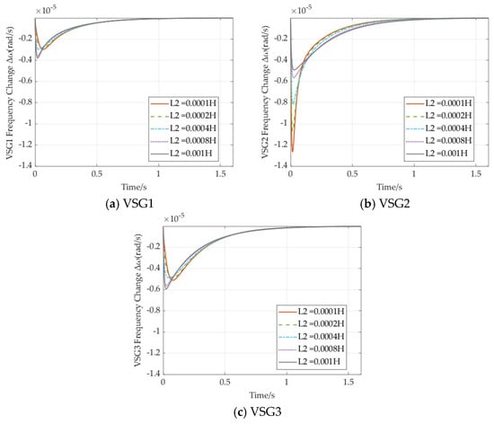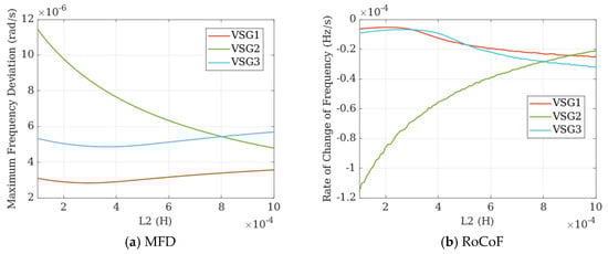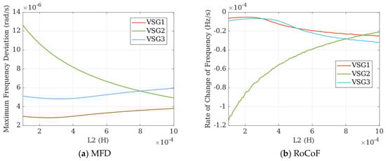 From Figure 16, it can also be observed that as the port impedance L2 increases, both the MFD and RoCoF of VSG2 show a significant improvement trend. However, the frequency responses of the other two VSGs deteriorate correspondingly.