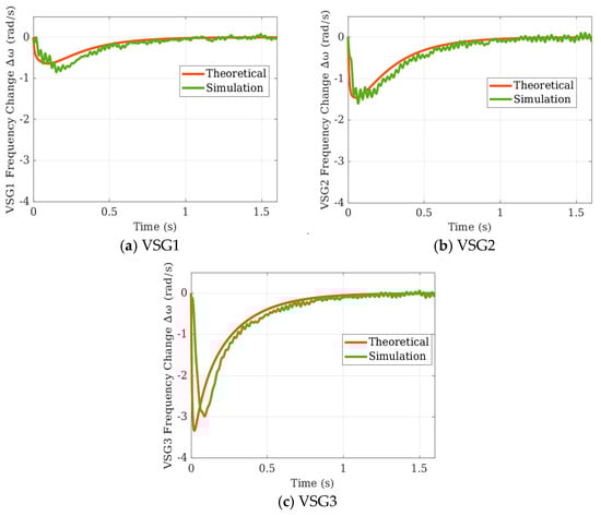 In a three-node three-VSG system, when an external load undergoes a step change at Node 1, the frequency response of three VSGs is shown in Figure 15. And the parameters of the simulation and theoretical experiment are shown in Table 6. It should be noted that in the simulation, to eliminate the influence of inner loop parameters on the dynamic frequency response of each VSG, the inner loop parameters are set to the same values.