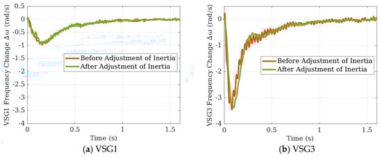 Firstly, by further developing a model based on the model in Section 2 into a dual-machine system, the transfer function for the node frequency response can be easily obtained. After the load changes, the voltage phase at the node will experience a sudden shift, and the subsequent frequency variation will be influenced by the rotational inertia set for both VSGs (J1 and J2) and the magnitude of the droop coefficient.