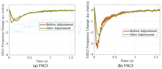 Step response of VSG frequency before and after adjustment.