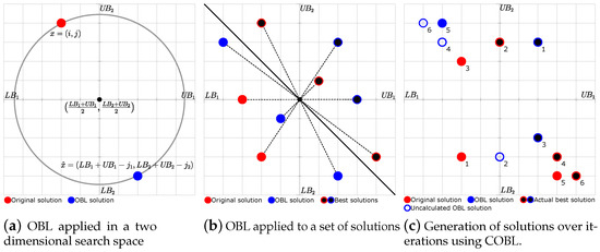 OBL can also be applied to a set of solutions where the performance of each solution of the original set and the opposite set is evaluated by keeping only the best half of all the solutions. In Figure 1b, an example of applying OBL to a set of six solutions in a 2D space is observed, where the red dots are the original solutions, the blue dots are the opposite solutions, and the dots with black centers are the selected solutions, by assuming that the best solutions are located over the main diagonal.