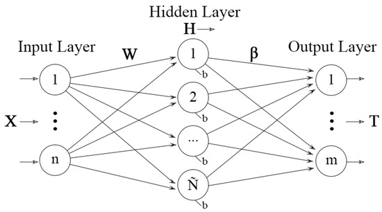 The extreme learning machine (ELM) is a neural network marked by the use of a single hidden layer with randomly initialized input weights and biases, removing the need to adjust the weights of the hidden layer model iteratively [29,30]. As a result, the training times are significantly reduced compared to gradient descent approaches that usually have problems associated with local minima convergences or incorrect learning steps. It is part of the random weights neural network family [31], as radial basis function [32], random vector functional link [33], and feed-forward neural networks with random weights presented in [34], all of these characterized by fast training times and good generalization performance. Figure 2 provides a visual representation of the ELM algorithm, where is the number of neurons in the hidden layer; is the input data of n features and N samples; is the expected output with m classes; and b correspond to the input weights and the hidden layer bias, respectively, both of which are randomly generated; is the hidden layer output of size ; and is the output weight.