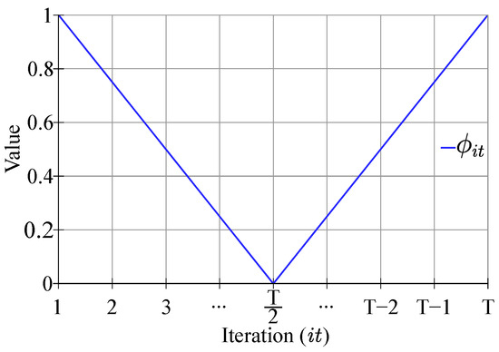 thus, is a vector of size T that has mapped values in the range [0,1] starting in 1 when , decreasing to 0 when , and increasing again to 1 when . In order to represent the possibility of moving towards or away from the previous solution based on the selected neighbor, Equation (2) is replaced by Equation (12).
