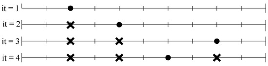 This criterion becomes stronger as the search space becomes more discrete, since it can guarantee that each new solution generated is unique, enabling measurement of the traveled percentage of the search space throughout the iterations of the algorithm. Similarly, it is a mechanism that ensures escape from local optima by forcing the exploration of new places when all its nearby area has already been marked. All this can be seen in Figure 4, a 1D example where it can be seen how the search space is marked throughout the iterations. By a single travel for each iteration, this method establishes the cardinality of the problem as the maximum possible value for the number of iterations of the parameterizers, because at that moment, the entire search space will have already been explored.