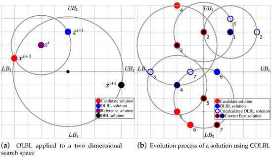 As with OBL, this approach can be applied directly (OLBL) or conditionally (COLBL), which allows for reducing unnecessary computation. A bi-dimensional example of OLBL is shown in Figure 5a,b, which shows an example of the evolution process of a solution using conditional OLBL (COLBL).