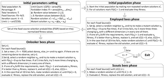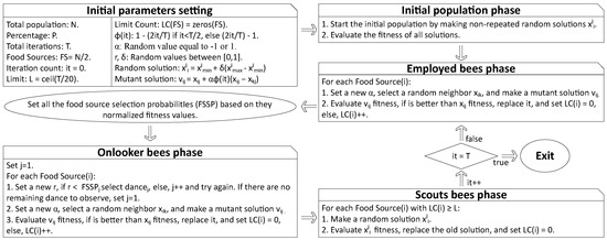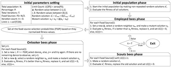 such that i corresponds to the i-th food source, j corresponds to the dimension selected to be modified, corresponds to the value of the i-th sample in the j-th dimension during the next iteration, corresponds to the value of the i-th sample in the current j-th dimension, is the random value previously explained, and corresponds to the value of the j-th dimension of a randomly selected k neighbor that must be different from i. Once an element of the periphery has been exploited, the employed bee returns to the hive to report on the quality and location of the food source based on the “waggle dance”, whereas the onlooker bees evaluate the dances and select one of them to continue in the following phase.