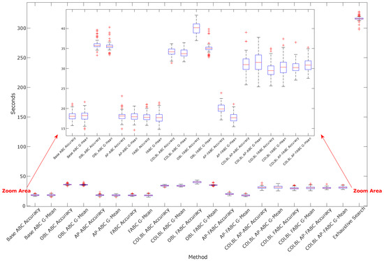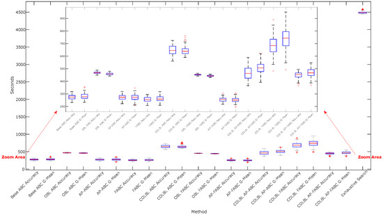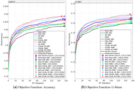 In terms of the time, the ABC parameterizers use between 5% and 16.6% of the time spent by the exhaustive search in general for both databases. The differences between the methods in this metric are given by the presence of OBL, whether it is conditional or not, the different number of scout bee calls, the focus on R-ELM executions with different number of hidden neurons, and finally, although to a lesser extent, the complexity of the algorithm of each proposal. Although COLBL AP-FABC has three implemented proposals, its time is below the average of the rest of the OBL-based algorithms, which could mean that the complexity of the proposals is negligible with respect to the total execution time of the neural network. It is necessary to take into account that FRI forces the parameterizers to always explore new locations. Consequently, as the local optimum zones are explored, the algorithm acquires a greater probability of locating itself in new zones. It can reduce premature convergence (a recurring problem in the base ABC algorithm), in addition to generating a greater balance between exploitation and exploration, by allowing a convergence towards the global optimum of the search space.