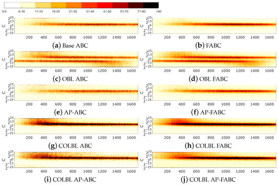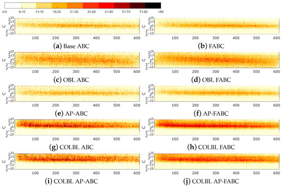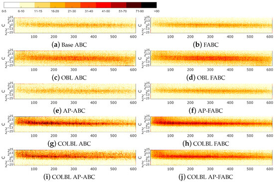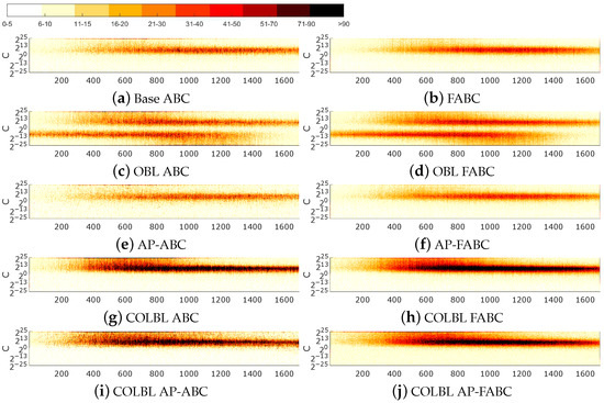 - COLBL (COLBL ABC): The number of executions increases to just under double. Looking at the number of visits, the standard deviation increases to more than double initially but decreases as the number of repetitions of visits increases. The distribution of visits shifts largely to the right, implying a greater repetition of solutions. The heat maps suggest that these repetitions are focused on the areas with the highest performance, eliminating the mirror effect of the OBL.