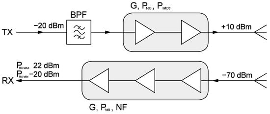 Schematic diagram of the output and input RF chains. The values indicated on the transmitting and receiving stages represent worst-case scenarios. The transmitter power is set to enable measurements within a range of several hundred meters, adhering to ISM band limitations. The receiver power is the maximum input power that the amplifier chain can tolerate without incurring significant intermodulation distortion, which would degrade radar measurement performance.