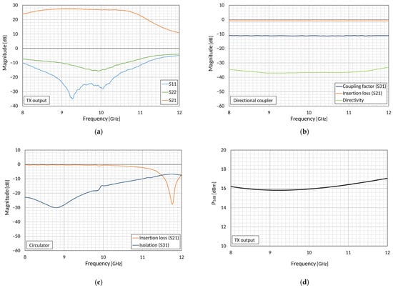 (a) S-parameters of a transmitter amplifier chain; (b) S-parameters of the directional couples; (c) S-parameters of the circulator; (d) 1-dB compression point of output amplifiers.