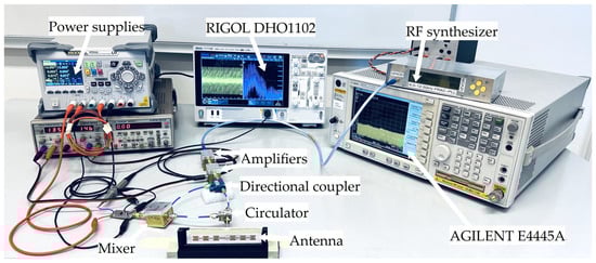 Following amplification, the signal was routed through a directional coupler. While radar systems typically employ two antennas, a single antenna can suffice for both transmission and reception by incorporating a circulator. This approach minimizes costs. The scattered signal was subsequently routed to the SIM-153+, Mini-Circuits, Brooklyn, New York, NY, USA mixer alongside a reference signal sourced from the directional coupler. A −10 dB coupling was selected to ensure adequate LO levels while complying with industrial, scientific, and medical (ISM) region limitations, considering the signal levels and achievable antenna gain (effective radiated power). Although band-pass filters are commonly used in PIC systems to eliminate unwanted frequency components, their inclusion can be avoided by utilizing a highly narrowband antenna and a suitable circulator. In our specific setup, both components effectively suppress harmonic components by over 70 dB, rendering a dedicated band-pass filter unnecessary.