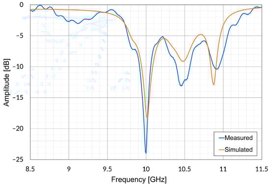 Comparison of simulated and measured antenna reflection coefficient (S11 parameter).