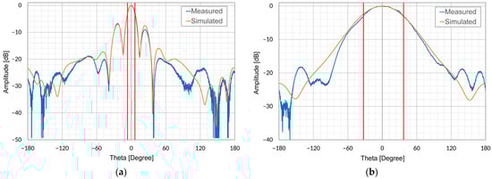 Comparison of simulated and measured radiation patterns. (a) Horizontal plane, Directivity: 18.18 dBi; (b) Vertical plane, Directivity: 8.71 dBi.
