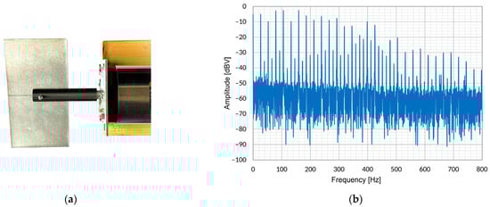 (a) Servo motor with a rectangular rotor blade attached to its shaft, serving as a known radar cross-section target. (b) Frequency domain reflection of the target at a constant speed of 26 revolutions per second.
